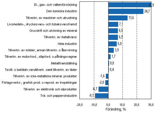 Under juni-augusti ökade omsättningen mest inom el-, gas- och vattenförsörjningen, med 33,9 procent, och inom den kemiska industrin, med 24,7 procent. Omsättningsökningen var snabb också inom tillverkningen av maskiner och utrustning, inom tillverkningen av metallprodukter, inom gruvdrift och utvinning av mineral samt inom tillverkningen av livsmedel, drycker och tobak. Däremot minskade omsättningen inom tillverkning av elektronik- och elprodukter med 6,7 procent och inom trä- och pappersindustrin med 9,1 procent jämfört med året innan.