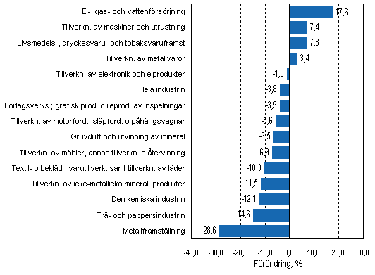 Under oktober-december ökade omsättningen inom el-, gas- och vattenförsörjning (17,6 %), tillverkning av maskiner och utrustning (7,4 %), livsmedelsindustrin (7,3 %) och tillverkning av metallvaror (3,4%). Inom andra näringsgrenar minskade omsättningen under årets sista kvartal. Mest minskade omsättningen inom metallframställning, där den var 28,6 procent lägre än under det sista kvartalet året innan.