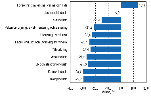 Omsättningen ökade under januari-mars inom försörjning av el, gas, värme och kyla (13,8 %) samt inom livsmedelsindustrin (0,2 %). Mest minskade omsättningen inom den kemiska industrin, där den var 29,8 procent mindre jämfört med motsvarande period året innan. Med undantag av försörjning av el, gas, värme och kyla samt livsmedelsindustrin minskade omsättningen med tvåsiffriga tal inom alla betydande näringsgrenar.