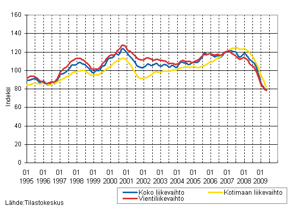 Metsäteollisuuden liikevaihdon, kotimaan liikevaihdon ja vientiliikevaihdon trendisarjat 1/1995 - 5/2009, 2005=100, (TOL 2008)