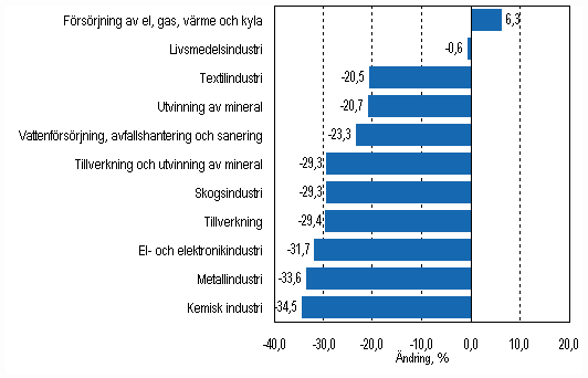 Omsättningen ökade under mars-maj bara inom el, gas, värme och kyla (6,3 %). Omsättningen minskade inom de flesta industrinäringsgrenar med mer än 20 procent under mars-maj jämfört motsvarande period året innan. Snabbast var minskningen inom kemiska industrin (-34,5 %) och inom den metallindustrin (33,6 %).