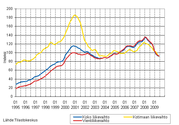 Elektroniikka- ja sähköteollisuuden liikevaihdon, kotimaan liikevaihdon ja vientiliikevaihdon trendisarjat 1/1995 - 6/2009, 2005=100, (TOL 2008)