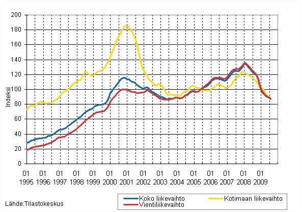 Elektroniikka- ja sähköteollisuuden liikevaihdon, kotimaan liikevaihdon ja vientiliikevaihdon trendisarjat 1/1995 - 8/2009, 2005=100, (TOL 2008)