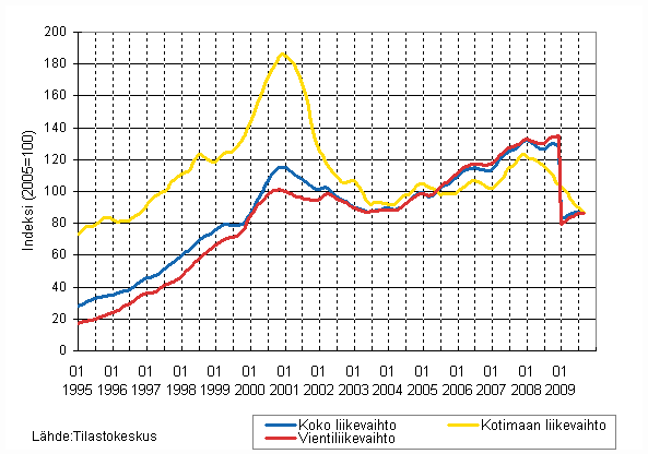 Elektroniikka- ja sähköteollisuuden liikevaihdon, kotimaan liikevaihdon ja vientiliikevaihdon trendisarjat 1/1995 - 9/2009, 2005=100, (TOL 2008)