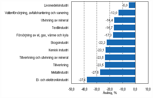 Under augusti-oktober gick omsättningen ned inom alla näringsgrenar. Minst var nedgången inom livsmedelsindustrin (-5,0 %). Inom övriga industrinäringsgrenar var minskningen betydligt större. Snabbast var minskningen inom den el- och elektronikindustrin (-37,6 %) samt inom metallindustrin (-27,5 %).