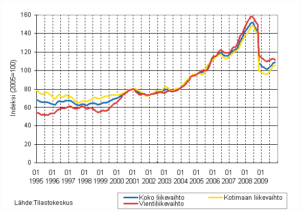 Kemianteollisuuden liikevaihdon, kotimaan liikevaihdon ja vientiliikevaihdon trendisarjat 1/1995 - 11/2009, 2005=100, (TOL 2008)