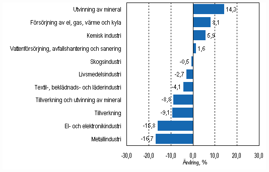 Omsättningen minskade inom flera näringsgrenar under november-januari. Snabbast var minskningen inom metallindustrin (-16,7 %) samt inom el- och elektronikindustrin (-15,8 %). Den minsta minskningen hade skogsindustrin (-0,5 %) och livsmedelsindustrin (-2,7 %). Mest ökade utvinning av mineral (14,3 %) samt försörjningen av el, gas, värme och kyla (8,1 %).