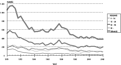 Tieliikenteessä kuolleet ikäryhmän mukaan (1970-2005)