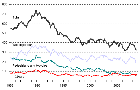 A total of 5 122 road traffic accidents involving personal injury happened in the January to September period. In them, 236 persons were killed and 6 398 persons injured. The number of persons killed was 53 lower and that of persons injured 5 higher than in the corresponding period of 2007. Of the person who were killed, 138 travelled by passenger car, 3 by van, 3 by lorry, 33 by motorcycle and 9 by moped. Pedestrians killed numbered 33 and cyclists 9. In addition, 8 other road user were killed.