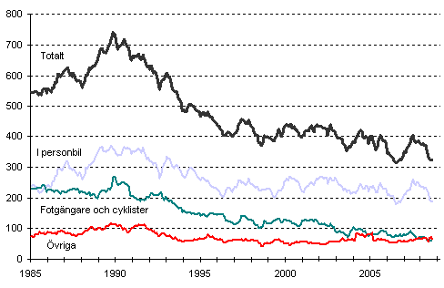 I januari-september var totalantalet vägtrafikolyckor med personskada 5 122. I olyckorna dog 236 och skadades 6 398 personer. Antalet döda var 53 mindre och antalet skadade 5 större än under motsvarande period år 2007. Av de döda rörde sig 138 med personbil, 3 med paketbil, 3 med lastbil, 33 med motorcykel och 9 med moped. I vägtrafiken dog 33 fotgängare och 9 cyklister. Ytterligare dog 8 andra personer som använde väg.