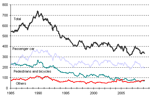 A total of 1 056 road traffic accidents involving personal injury happened in the January to March period. In them, 54 persons were killed and 1 386 persons injured. The number of persons killed was 15 lower and that of persons injured 123 lower than in the corresponding period of 2008. Of the person who were killed, 36 travelled by passenger car, 4 by van and 3 by lorry. Pedestrians killed numbered 9 and cyclists 1. In addition, 1 other road user was killed.