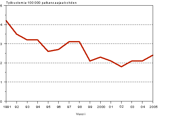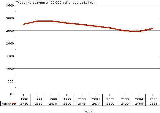 Suomalaisten palkansaajien työpaikkatapaturman riski on alentunut 1990 -luvun lopusta alkaen (kuvio 1). Tämä käy ilmi, kun suhteutetaan palkansaajien työpaikkatapaturmat 100 000 palkansaajaa kohden. Vuosien 1998-2004 välillä työtapaturmasuhde aleni noin 14 prosenttia. Vuonna 2005 tapaturmasuhde kääntyi lievään nousuun. Tuolloin sattui 2 581 työpaikkatapaturmaa 100 000 palkansaajaa kohden, joka on viitisen prosenttia (4,6 %) enemmän kuin vuotta aiemmin.