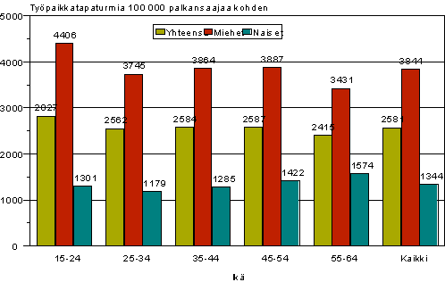 Miesten työtapaturmariski on suurin nuorimmassa ikäryhmässä. Nuorille miehille sattui 4 406 vähintään neljän päivän työstä poissaoloon johtanutta työpaikkatapaturmaa sataatuhatta palkansaajaa kohden vuonna 2005 (kuvio 2). Tämä merkitsi sitä, että tapaturmasuhteella laskettu riski oli 14 prosenttia suurempi kuin miespalkansaajilla keskimäärin. Riski alenee lähes tasaisesti iän myötä. Toisin kuin miehillä, naisten tapaturmariski on korkein vanhimmassa, 55-64-vuotiaiden ikäryhmässä. Ikäryhmien väliset erot ovat kuitenkin varsin pieniä. Tapaturmasuhteen kautta valottuva kuva sukupuolen mukaisesta työtapaturmatilanteesta onkin pysytellyt lähes ennallaan vuodesta toiseen.