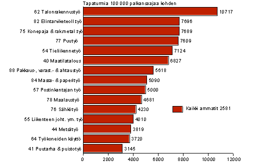 Seuraavana tulevat elintarviketeollisuustyön (7 696), konepaja- ja rakennusmetallityön (7 689) ja puutyön (7 609) ammattiryhmät. Konepaja- ja rakennusmetallityön ammattiryhmässä tapaturmasuhteella mitattu tapaturmariski nousi seitsemisen prosenttia, kun elintarviketeollisuustyön ammateissa toimivilla riski pieneni noin yhdeksän prosenttia ja puutyön ammateissa toimivilla nelisen prosenttia edellisvuodesta. Kuviossa kolme on esitetty ammattiryhmät, joissa työpaikkatapaturman riski on keskimääräistä korkeampi. Keskimäärin vähintään neljän päivän työkyvyttömyyteen johtaneita työpaikkatapaturmia sattui 2 581 sataatuhatta palkansaajaa kohden. Lukumääräisesti eniten tapaturmia sattui edellisvuosien tapaan eri teollisuuden ammattiryhmissä.
