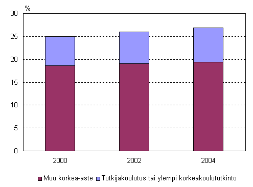 Korkeasti koulutettu väestö, osuus 16-74-vuotiaista vuosina 2000-2004