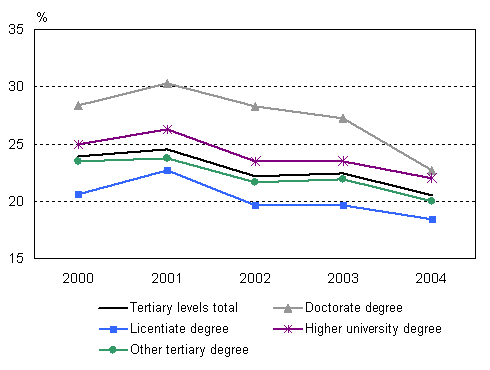 Altogether 20.5 per cent of highly educated employees changed jobs in 2004. The share was 2.5 percentage points lower than in 2000. The rate of mobility decreased most, from 28 to 23 per cent, among those with a degree at the doctorate level. Rates of mobility generally increase as the level of education rises, but an exception to this are persons with a licentiate level degree, among whom the rate of mobility was the lowest throughout the examined years. A highly educated person is here defined as someone with at least the lowest level of tertiary degree and mobility in this context refers to having changed jobs or become employed since the previous year.