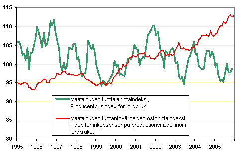 Utvecklingen av jordbrukets prisindex 2000=100 åren 1995-2005