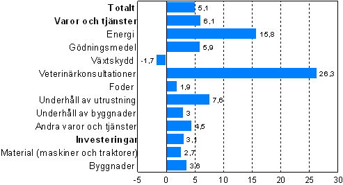 Prisstegringen på 6,1 procent på varor och tjänster inom jordbruket beror huvudsakligen på att energipriserna gick upp med 15,8 procent och priserna på gödningsmedel med 5,9 procent. Bränslepriset har stigit med 25,4 procent på årsnivå. Priserna på de varor och tjänster som ingår i jordbrukets investeringar steg mest på grund av att maskiner och annan utrustning blev 2,7 procent dyrare och byggnadsinvesteringarna 3,6 procent dyrare. Växtodlingsmaskinerna blev 6,5 procent dyrare. Växtskyddsmedlen var vid sidan av utsäde den enda grupp där priserna sjönk. Priserna på växtskyddsmedel sjönk med 1,7 procent och utsädet med 4,1 procent.