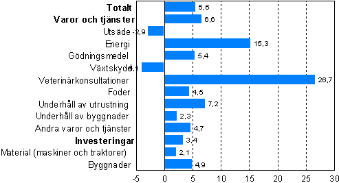 Prisstegringen på 6,6 procent på varor och tjänster inom jordbruket beror huvudsakligen på att energipriserna gick upp med 15,3 procent och priserna på gödningsmedel med 5,4 procent. Bränslepriset har stigit med 22,7 procent på årsnivå. Priserna på de varor och tjänster som ingår i jordbrukets investeringar steg mest på grund av att maskiner och annan utrustning blev 2,5 procent dyrare och byggnadsinvesteringarna 4,9 procent dyrare. Växtodlingsmaskinerna blev 2,3 procent dyrare. Växtskyddsmedlen var vid sidan av utsäde den enda grupp där priserna sjönk. Priserna på växtskyddsmedel sjönk med 4,1 procent och utsädet med 2,9 procent.