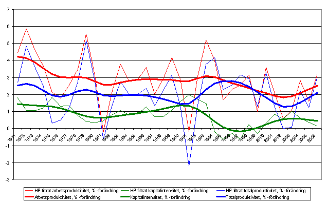 Den långsiktiga tillväxttrenden som beräknats med Hodrick-Prescott-filter visar att tillväxttakten för arbetets produktivitet har sjunkit till omkring 2-2,5 procent för hela samhällsekonomins del efter år 1995 medan tillväxttakten under den föregående perioden, 1975-1995, var omkring 3 procent per år. På motsvarande sätt visar den långsiktiga tillväxttrenden för totalproduktiviteten att totalproduktiviteten varierade mellan omkring 1,5-2 procent före år 1993. Från år 1993 till år 2000 har den årliga tillväxttakten för totalproduktiviteten varit i genomsnitt ungefär 2-3 procent. Efter år 2000 var tillväxttrenden för totalproduktiviteten som lägst år 2002, dvs. 1,3 procent. Efter det har tillväxttrenden åter gått upp till ungefär 2 procent. Före år 1993 har kapitalintensitetens tillväxttrend varit omkring 1 procent. Efter det avtog tillväxttakten tydligt åren 1993-2000. Efter år 2000 har den årliga tillväxttakten för kapitalintensiteten varit omkring 0,5 procent.
