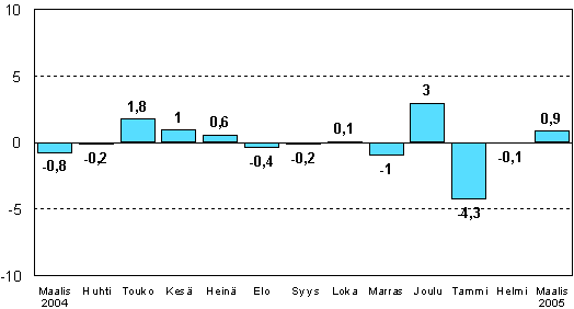 Teollisuuden kausitasoitettu tuotanto oli Tilastokeskuksen mukaan vuoden 2005 maaliskuussa 0,9 prosenttia suurempi kuin helmikuussa. Teollisuustuotannon kausitasoitettu tuotantomäärä kasvoi 1,1 prosenttia vuoden 2004 maaliskuuhun verrattuna.
