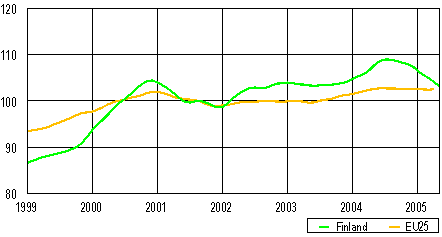 Trend in industrial output 1999-2005, (Finland and EU 25), 2000=100