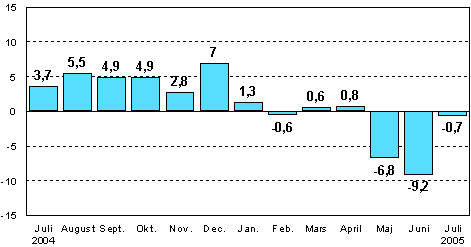 Enligt Statistikcentralen var den säsongrensade industriproduktionen 0,7 procent mindre i juli 2005 än i juli 2004.