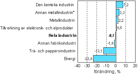 Arbetskonflikten inom pappersindustrin, som upphörde i juni, återspeglades ännu i produktionssiffrorna för juli. Av de huvudsakliga näringsgrenarna sjönk energiförsörjningen mest, dvs. med 23,6 procent. Produktionen inom trä- och pappersindustrin sjönk i juli med 13,1 procent. Mest ökade produktionen inom den kemiska industrin, dvs. med 7,2 procent. Produktionen inom metallindustrin ökade med 2,2 procent.