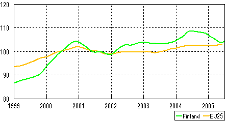 Trenden för industriproduktionen 1999-2005, (Finland och EU 25), 2000=100