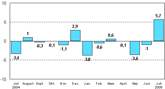 Enligt Statistikcentralen var den säsongrensade industriproduktionen 5,7 procent större i juli 2005 än i juni. Jämfört med juli 2004 sjönk den säsongrensade industriproduktionsvolymen med 0,7 procent. Produktionen för januari-juli sjönk med 3 procent från året innan.