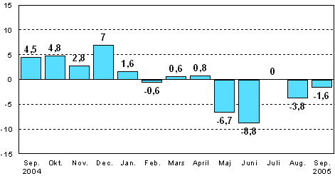 I september 2005 var den säsongrensade industriproduktionen enligt Statistikcentralen 1,6 procent mindre än i september 2004.