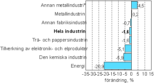 Jämfört med året innan sjönk energiförsörjningen mest i september, med närmare 21 procent. Bakom nedgången låg energiimporten, som ökat kraftigt. Tillverkningen av elektronik- och elprodukter sjönk i september med drygt 5 procent. Produktionen inom den kemiska industrin minskade med något under 6 procent. Produktionen inom den övriga metallindustrin ökade alltjämt i september. Tillväxten berodde i stor utsträckning på den kraftiga ökningen inom fordonsindustrin. Också tillverkningen av maskiner och apparater ökade kraftigt i september.