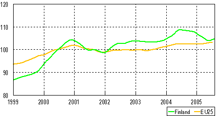 Trenden för industriproduktionen 1999-2005, (Finland och EU25), 2000=100