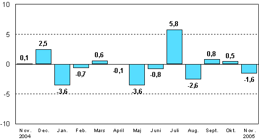 Enligt Statistikcentralen var den säsongrensade industriproduktionen 1,6 procent mindre i november 2005 än i oktober. Jämfört med november 2004 sjönk den säsongrensade produktionsvolymen med 3,1 procent. Produktionen för januari-november sjönk med 2,5 procent från året innan.