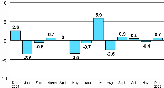According to Statistics Finland, seasonally adjusted industrial output was 0.7 higher in December 2005 than in November. Seasonally adjusted volume of industrial output fell by 2.8 per cent year-on-year from December 2004. Industrial output fell by 2.5 per cent last year.