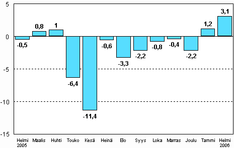 Teollisuuden kausitasoitettu tuotanto oli Tilastokeskuksen mukaan vuoden 2006 helmikuussa 3,1 prosenttia suurempi kuin vuoden 2005 helmikuussa. Teollisuustuotannon kasvu on alkuvuonna ollut vahvaa.