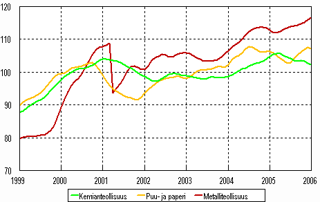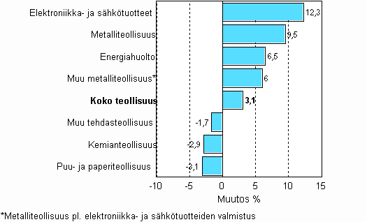 Teollisuustuotannon kasvu oli helmikuussa kaksijakoinen. Tuotannon kasvuvauhti nopeutui metalliteollisuudessa. Sen sijaan puu- ja paperiteollisuuden, kemianteollisuuden ja muun tehdasteollisuuden tuotanto laski edelleen. Metalliteollisuuden tuotanto kasvoi 9,5 prosenttia vuoden 2005 helmikuuhun verrattuna. Kasvua vauhditti sähkö- ja elektroniikkatuotteiden valmistus, joka kasvoi runsaat 12 prosenttia. Myös muun metalliteollisuuden tuotanto kasvoi 6 prosenttia, kun tammikuussa kasvu oli 3 prosenttia vuoden takaiseen verrattuna. Myös energiahuolto kasvoi runsaat 6 prosenttia.