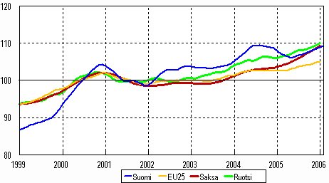 Teollisuustuotannon trendi 1999-2006, (Suomi, Saksa, Ruotsi ja EU 25), 2000=100