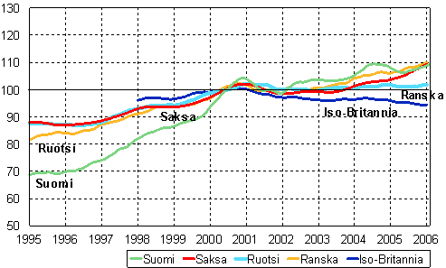 Teollisuustuotannon trendi TOL C,D,E, Suomi, Saksa, Ruotsi, Ranska ja Iso-Britannia 1995 - 2006, 2000=100