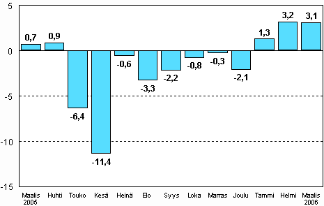 Teollisuuden kausitasoitettu tuotanto oli Tilastokeskuksen mukaan vuoden 2006 maaliskuussa 3,1 prosenttia suurempi kuin vuoden 2005 maaliskuussa. Teollisuustuotannon kasvu on alkuvuonna ollut vahvaa. Tammi-maaliskuussa kausitasoitettu tuotanto kasvoi 2,5 prosenttia vuoden takaisesta.
