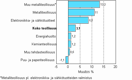 Puu- ja paperiteollisuutta lukuun ottamatta teollisuustuotanto kasvoi maaliskuussa kaikilla päätoimialoilla vuoden takaiseen verrattuna. Tuotannon kasvuvauhti nopeutui metalliteollisuudessa. Metalliteollisuuden tuotanto kasvoi 11 prosenttia vuoden 2005 maaliskuuhun verrattuna. Elektroniikka- ja sähkötuotteiden valmistus kasvoi runsaat 8 prosenttia. Vahvinta kasvu oli muussa metalliteollisuudessa, jossa tuotanto kasvoi runsaat 13 prosenttia. Myös kemianteollisuuden tuotanto kasvoi hieman.