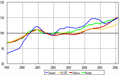 Teollisuustuotannon trendi 1999-2006, (Suomi, Saksa, Ruotsi ja EU 25), 2000=100