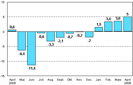 I april 2006 var den säsongrensade industriproduktionen enligt Statistikcentralen 5 procent större än i april 2005. Industriproduktionen har ökat kraftigt i början av året. I januari-april ökade den säsongrensade industriproduktionen med 3,4 procent från året innan.