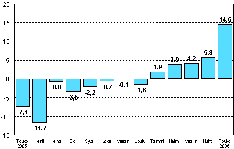 Teollisuuden kausitasoitettu tuotanto oli Tilastokeskuksen mukaan vuoden 2006 toukokuussa 14,6 prosenttia suurempi kuin vuoden 2005 toukokuussa. Teollisuustuotannon kasvu on alkuvuonna ollut vahvaa. Tammi-toukokuussa kausitasoitettu tuotanto kasvoi 6,0 prosenttia vuoden takaisesta.