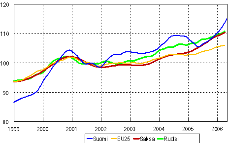 Teollisuustuotannon trendi 1999-2006, (Suomi, Saksa, Ruotsi ja EU 25), 2000=100