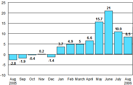 According to Statistics Finland, seasonally adjusted industrial output was 8.5 per cent higher in August 2006 than in August 2005. Industrial output has grown strongly in the early part of the year. The warm and dry summer also boosted peat excavation. Mining and quarrying increased by as much as 77 per cent from twelve months back. In the January to August period, seasonally adjusted industrial output grew by 9.4 per cent from one year ago.