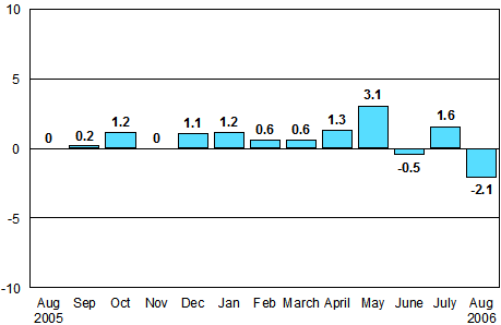 According to Statistics Finland, seasonally adjusted industrial output declined by 2.1 per cent in August 2006 from July. Seasonally adjusted volume of industrial output increased by 8.5 per cent year-on-year from August 2005.
