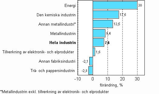 Av de huvudsakliga näringsgrenarna ökade energiförsörjningen mest i september, med 30 procent. Produktionen inom den kemiska industrin ökade med närmare 18 procent. Produktionen inom metallindustrin ökade med drygt 8 procent. Tillverkning av elektronik- och elprodukter gick upp med något under 2 procent. Övrig metallindustri ökade med 13,5 procent. Produktionen minskade mest inom trä- och pappersindustrin, med nästan 3 procent. Produktionen inom den övriga fabriksindustrin minskade med drygt 2 procent.