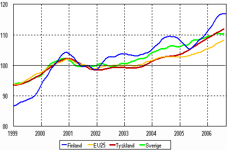 Trenden för industriproduktionen 1999-2006, (Finland, Tyskland, Sverige och EU 25), 2000=100