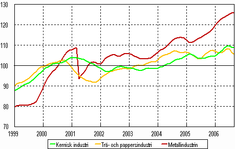 Trenden för industriproduktionen 1999-2006, september (Kemisk industri, trä- och pappersindustri och metallindustri), 2000=100